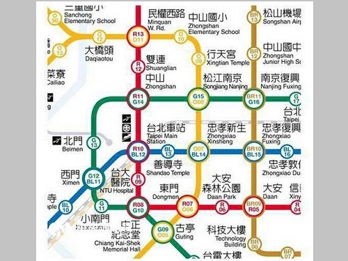 例えば赤で表されている淡水信義線ならRed LineのRをとって、R11のような番号になります。各線ごとに南から北、または西から東の順に01から始まる2桁の数字が振られます。2つの路線が乗り入れている台北駅などは、それぞれの路線2つの番号が付けられることになります。漢字や長い英語表記を読むのが困難な国の方々には記号での表示はわかりやすいですよね。あるいは出発駅から何駅めというのが数字でわかるので、距離感がつかみやすくなるかもしれません。